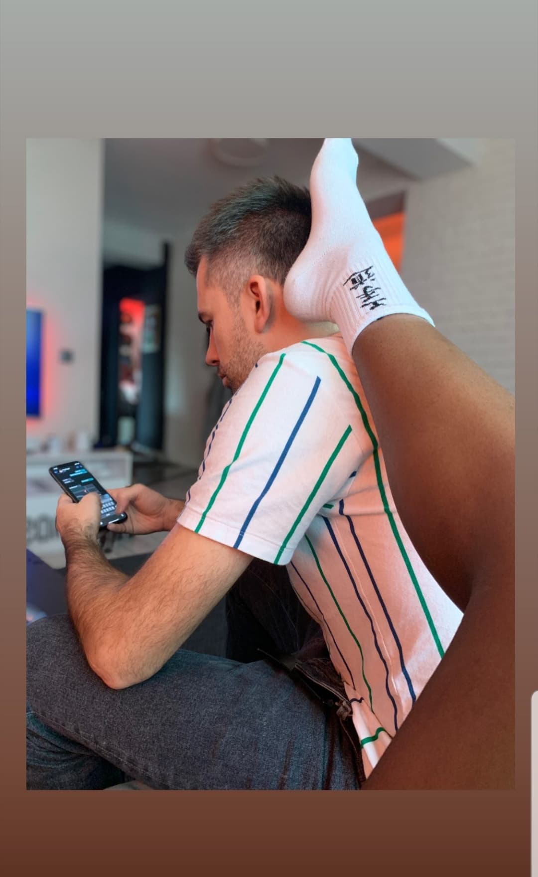 În timp ce Florin Ristei se uita în telefon, Naomi Hedman își ținea piciorul pe capul lui.