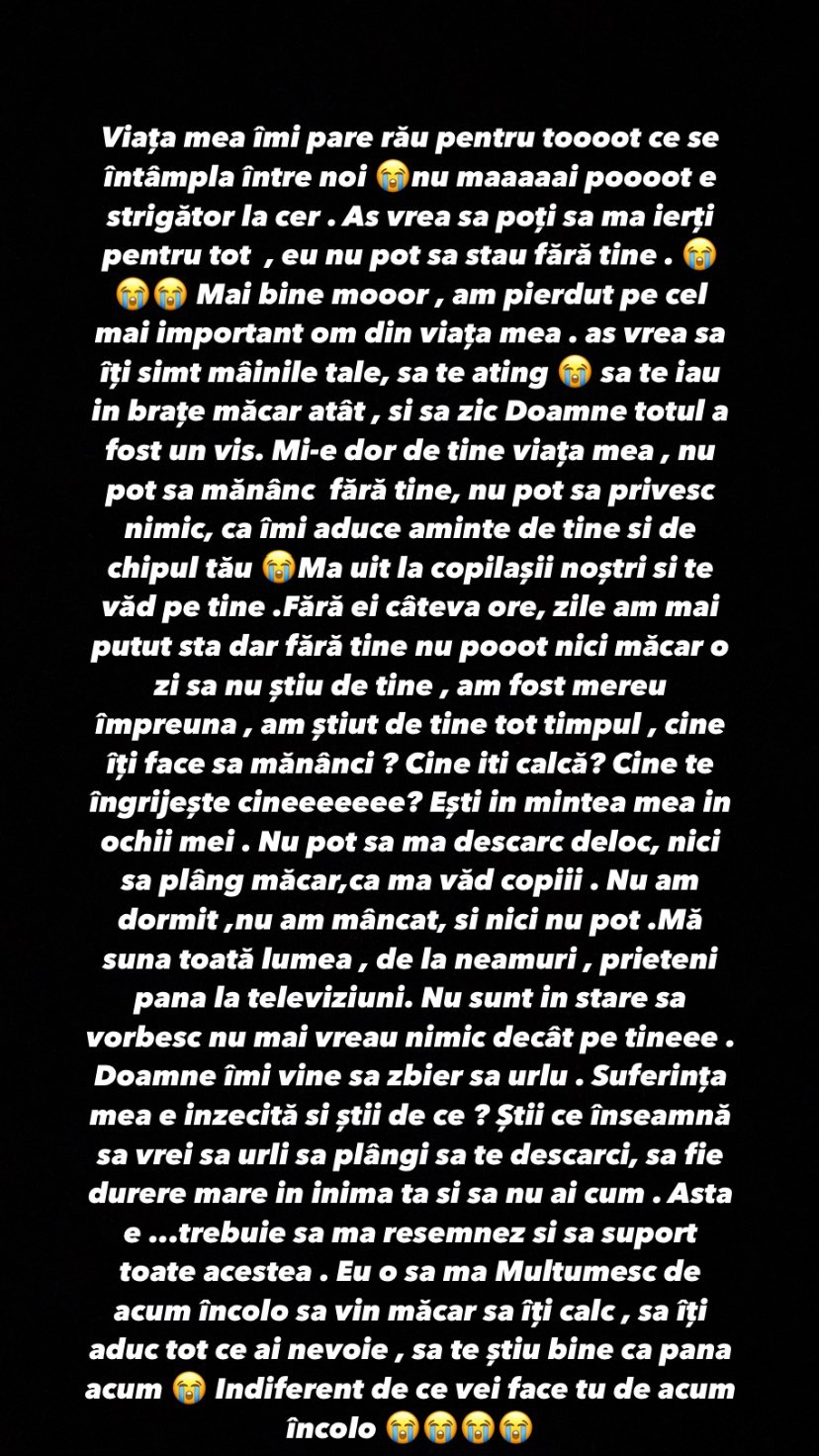 Orice bărbat greșește. Nu aruncați cu pietre până nu veți fi voi drepți în fața lui Dumnezeu.(...) El îmi dă cea mai mare putere. M-a făcut să înțeleg că iubirea noastră e prea mare. Noi suntem de nedespărțit. Avem 13 ani împreună, în care am făcut lucruri frumoase și cel mai important copiii noștri. În momentul acesta sunt sigură că ne împăcăm. Eu îl aștept cu brațele deschise, asta mi-a arătat și el.