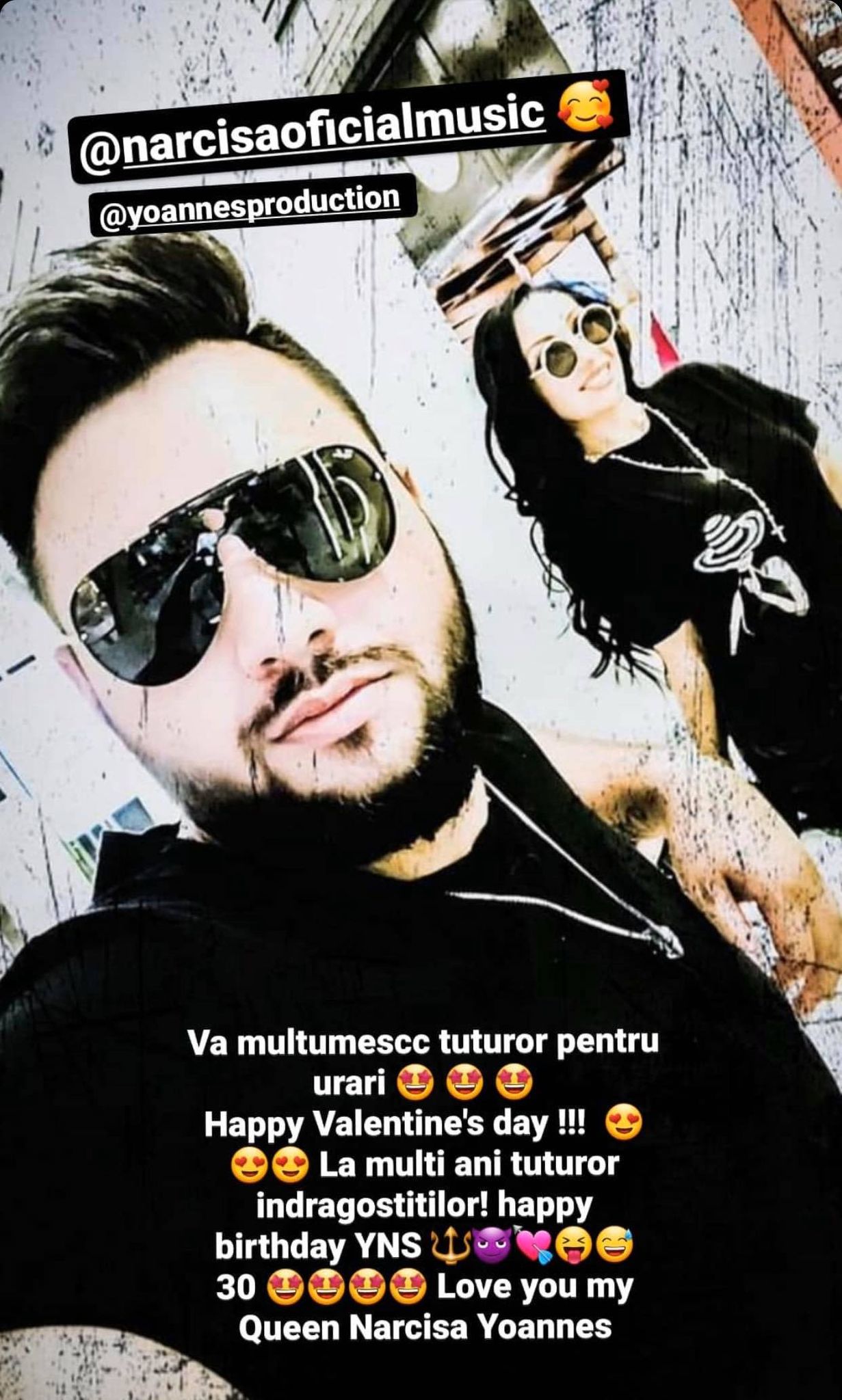 Va multumescc tuturor pentru urari. Happy Valentine's day !!! La multi ani tuturor indragostitilor! La mulți ani, YNS. Te iubesc, regina mea, Narcisa Moisa”, este mesajul postat de Yoannes pe rețeaua socială.