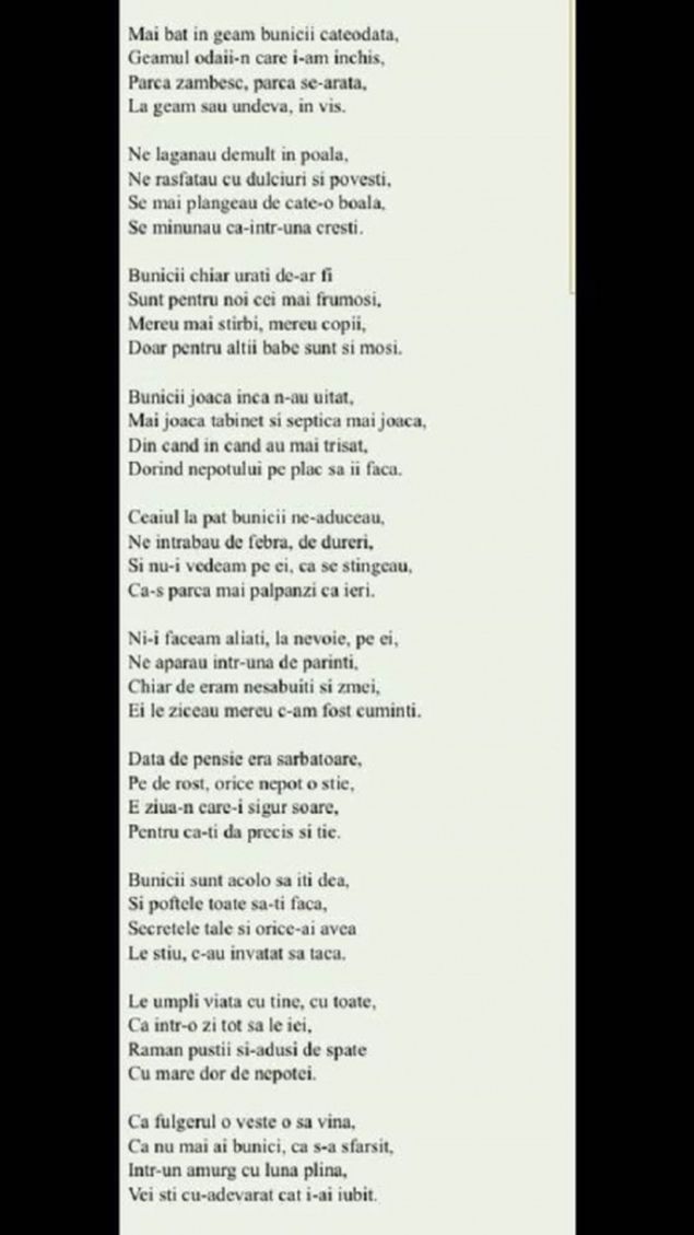 Natalia Mateut trece prin clipe grele. Bunicul ei a murit, iar vedeta a postat pe contul de socializare o poezie emotionanta despre bunici. Langa imagine, prezentatoarea a scris un mesaj emotionant: "Sa ne veghezi de sus bunicule! Te vom iubi mereu".