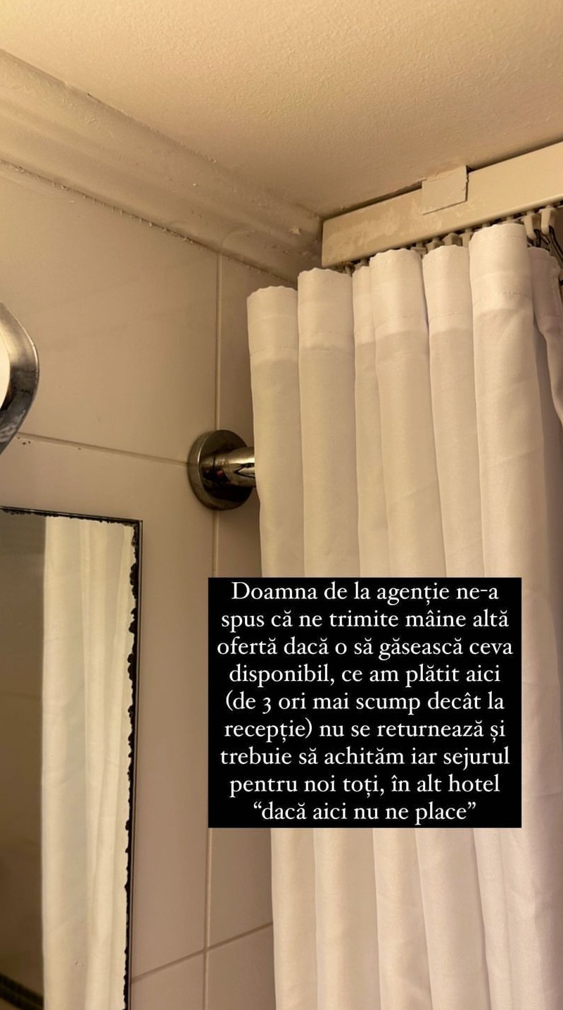 „Ce ni s-a promis și ce am primit este ceva ieșit din comun. Nu credeam că e posibil așa ceva, pentru că ăsta era cadoul nostru pentru nași, trebuia să fie ceva superb, de asta am și apelat la o agenție de turism, pentru că voiam să fie totul perfect. Nu vreți să știți cât de mare este diferența pe care am plătit-o noi pentru cameră și care este prețul camerei de la recepție, deci acum doamna de la agenție spune că «Ați plătit, asta era în ofertă, efectiv ați luat țeapă, la revedere» - asta a fost tot.
