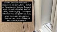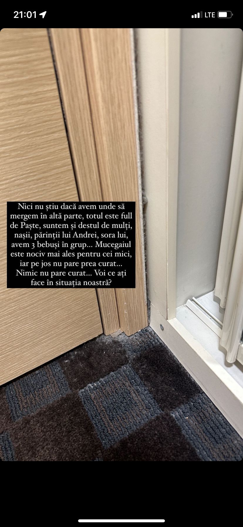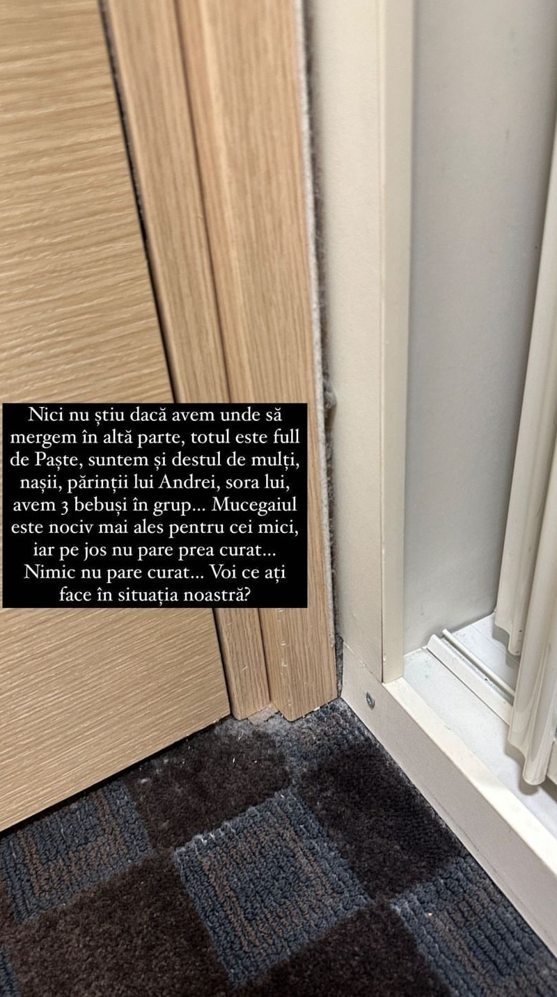 „Nici nu știu dacă avem unde să mergem în altă parte, totul este full (n.r.: plin) de Paște, suntem și destul de mulți, nașii, părinții lui Andrei, sora lui, avem trei bebeluși în grup… Mucegaiul este nociv, mai ales pentru cei mici, iar pe jos nu pare prea curat… Nimic nu pare curat… Voi ce ați face în situația noastră?