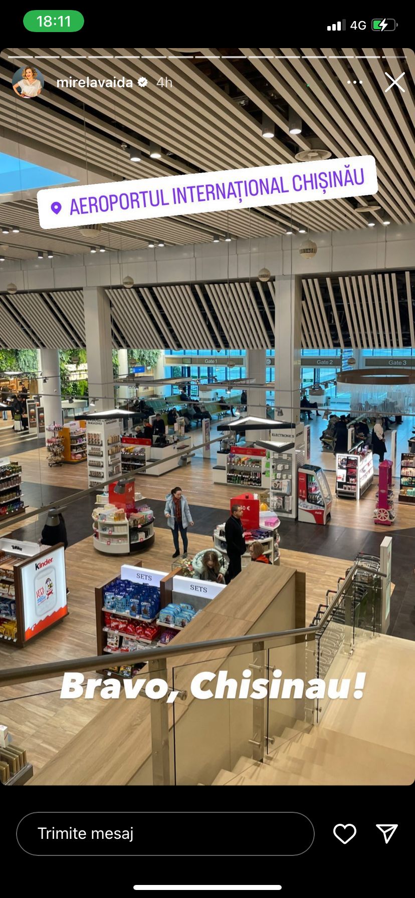 „Așa arată aeroportul din Chișinău! Se compară cu aeroportul Otopeni? Ne dau clasă oricând! Bravo lor! Pe când și la noi? Alo, București? UE? Bravo, Chișinău!”, a scris Mirela Vaida pe Instagram.