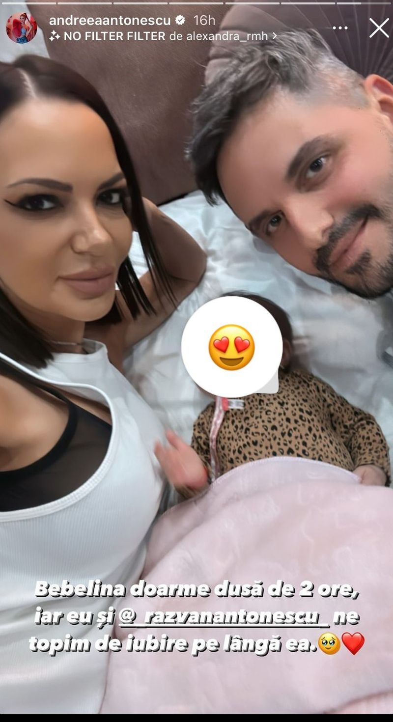 „Bebelina doarme dusă de 2 ore, iar eu și Răzvan ne topim de iubire lângă ea.”, a scris Andreea Antonescu în mediul online.
