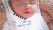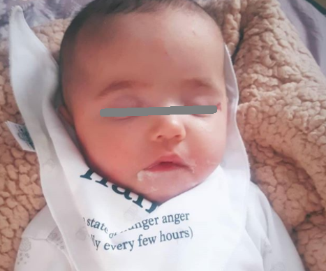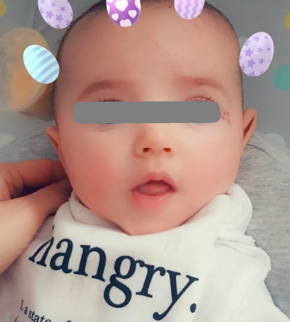 Micuta s-a nascut cu un semn dinstinctiv pe fata, un hemangiom care i-a aparut in partea exterioara a ochiului stang. Bebelusa are pe chip o formatiune asemanatoare alunitelor, de culoarea zmeurei, in coltul exterior al ochiului, iar parintii au mers la medic si s-au interesat daca pot scoate hemangiomul in urma unei interventii minore.