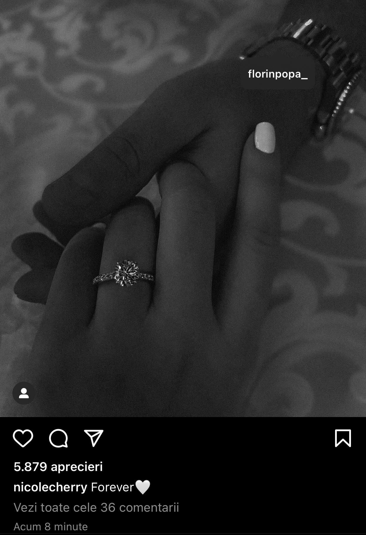 Nicole Cherry și Florin Popa urmează să facă pasul cel mare! Celebra cântăreața a fost cerută în căsătorie de tatăl copilului ei, ce urmează să vină pe lume în luna decembrie. Nicole a postat, sâmbătă seara, o fotografie cu inelul cu diamant, pe care l-a primit de la Florin, alături de descrierea emoționantă: ”Pentru totdeauna”.