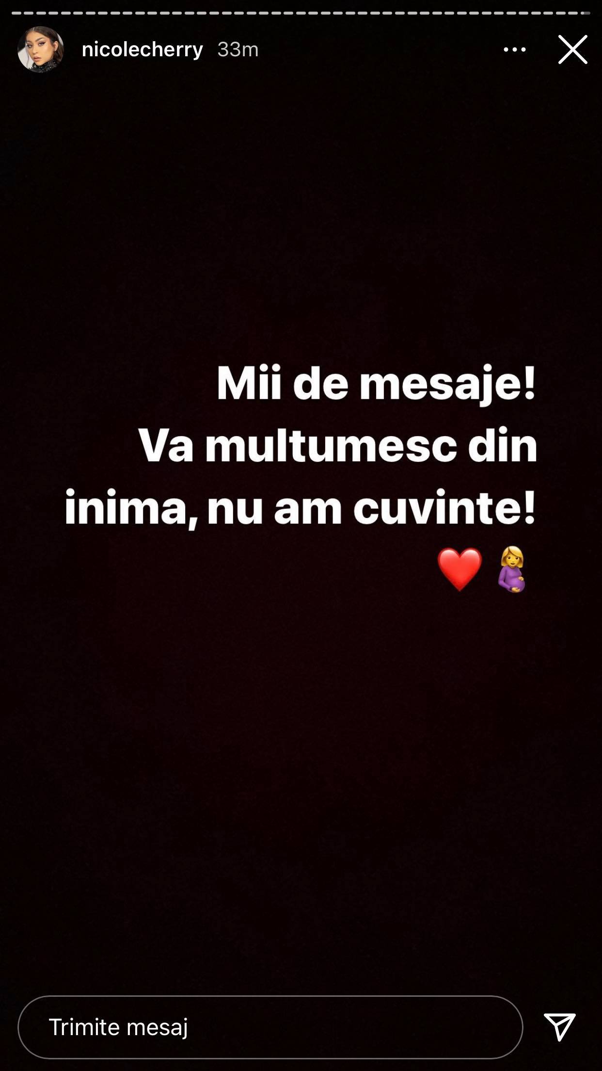 Celebra cântăreața a publicat, pe contul ei de Instagram, și primele imagini cu burtica de gravidă, pe care a încercat s-o țină ascunsă până ieri, când a dat vestea cea mare. Nicole a primit și foarte multe mesaje de susținere și felicitări din partea apropiaților, așa că a ținut să le mulțumească public pentru toate cuvintele frumoase: