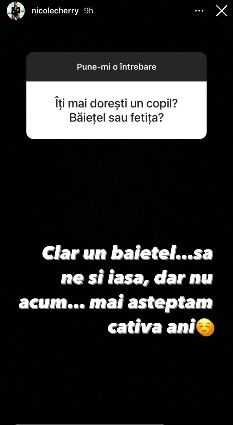 În urmă cu câteva ore, ea a inițiat o sesiune de întrebări și răspunsuri pe rețelele de socializare, căci nu are secrete față de cei care o urmăresc pe internet. Ei bine, un fan a profitat de ocazie pentru a afla dacă aceasta își mai dorește un copil: „Îți mai dorești un copil? Băiețel sau fetiță?”.
