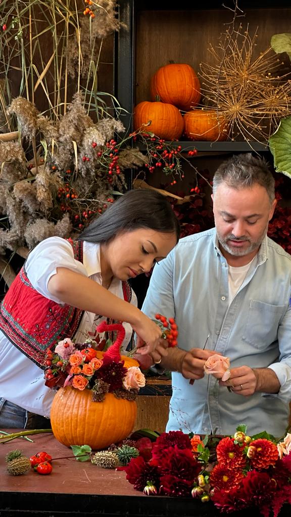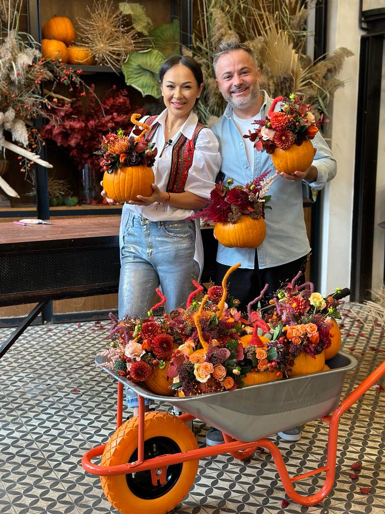 Odată începută luna octombrie, Nicu Bocancea și #echiparachetă au demarat lucrul pentru petrecerile și comenzile de Halloween, cu dovleci împodobiți și înveseliți de flori și accesorii, iar mâna lor dreaptă a devenit însăși Vlăduța Lupău, artista apărută special de la Cluj în „atelierul de Halloween” cu pasiune pentru flori și apreciere pentru floristul care s-a ocupat de decoruri la botezul băiețelului ei. „Am provocat-o pe Vlăduța să învețe să împodobească dovleci! Este o activitate foarte veselă și extrem de căutată luna aceasta, mai ales de părinții dornici să facă activități haioase împreună cu copiii. Să fii boboc de iris nu e simplu, așa că am început lucrul cu Vlăduța la atelier dis-de-dimineață, am umplut o roabă cu zeci de dovleci, încărcați de toamnă și de frumos, pe care i-am dăruit pe stradă trecătorilor în schimbul unui zâmbet.”, povestește master floristul internațional.