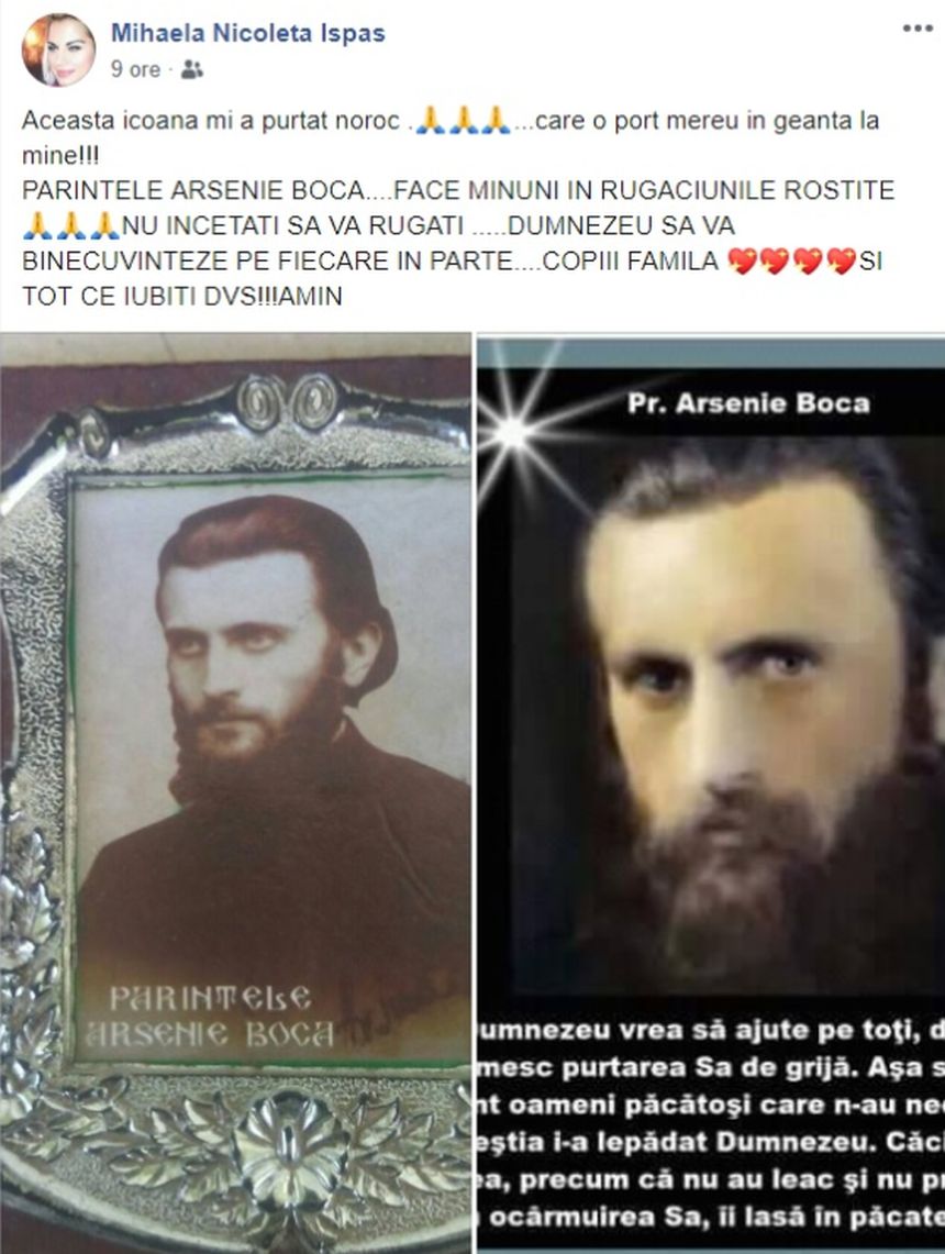 „Această icoană mi-a purtat noroc, pe care o port mereu în geantă la mine. Părintele Arsenie Boca face minuni în rugăciunile rostite. Nu încetaţi să vă rugaţi. Dumnezeu să vă binecuvânateze pe fiecare în parte, copii, familie şi tot ce iubiţi dumneavoastră.