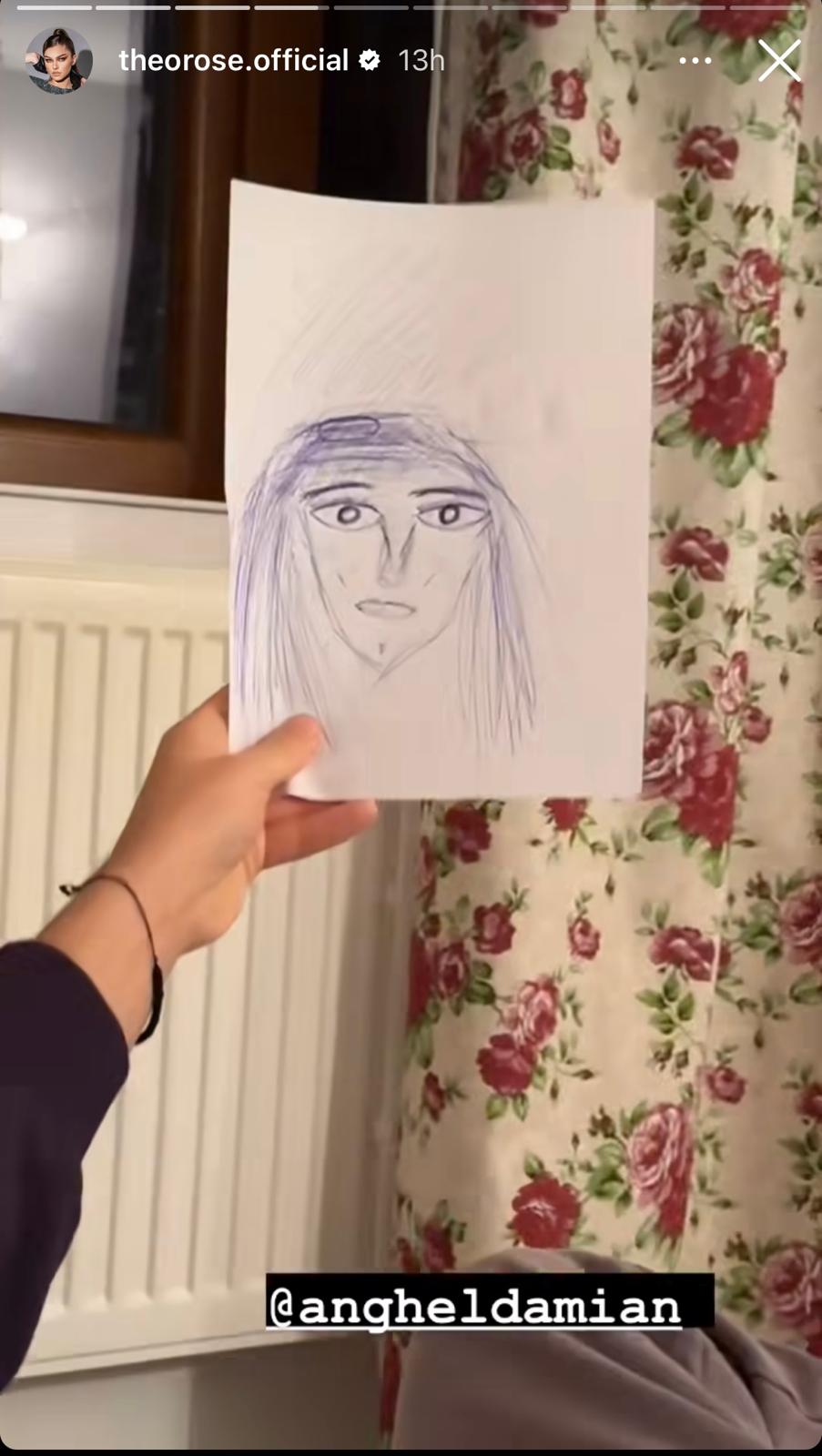 „Am desenat și eu și Anghel și la un moment dat ne-am propus să ne desenăm portretul unul altuia ca să comparăm la final și eu știind despre mine că sunt netalentată la desen, i-am zis că sunt vraiște și să nu aibă așteptări. Culmea e că mie chiar mi-a ieșit ceva, ceva.(...) Asta am văzut eu, zic că e decent. Ia vedeți-l pe el. Bravo tată, mulțumesc, să trăiești! (n.r. arată portretul său făcut de Anghel Damian).
