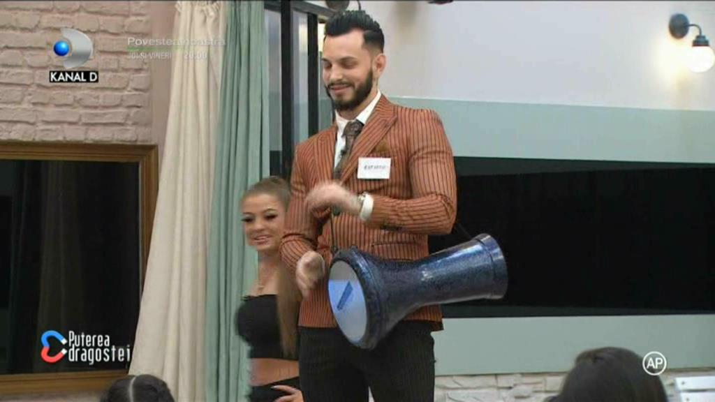 Noul concurent și-a făcut apariția în Casa Puterea Dragostei. Tânărul de 24 de ani a venit însoțit de o tarabană, la care a cântat, dar și de un mic cadou pentru fiecare fată în parte: brățări.