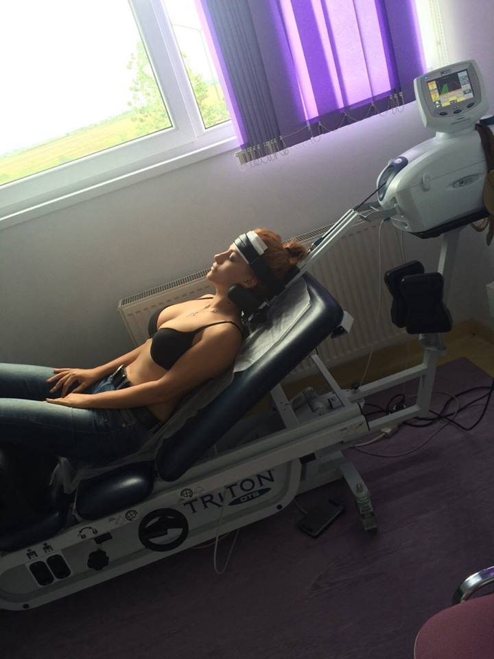 Oana Turcu face exercitii de recuperare intr-o clinica de specialitate si a tinut sa impartaseasca imaginea cu prietenii virtuali. Imbracata doar intr-o pereche de blugi si un sutien negru, prezentatoarea statea intinsa pe masa unui aparat special.