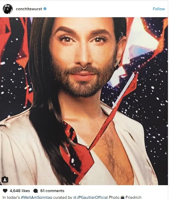 Daca pana acum Tom Neuwirth, cunoscut sub numele Conchita Wurst, a impresionat prin aparitiile impecabile, purtand rochii deosebite si elegante, acum castigatoarea cu barba de la Eurovision s-a afisat intr-un mod inedit pe retelele de socializare. Mai exact, a imbracat un o camasa pe care a purtat-o descheiata lasandu-i astfel la vedere parul de pe piept.