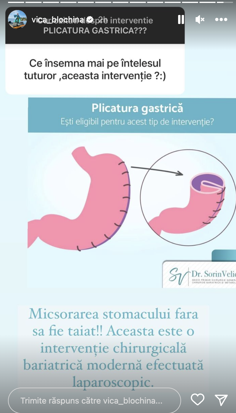 Vica a ținut să precizeze că stomacul nu a fost tăiat, ci micșorat, iar intervenția la care ea a apelat se numește plicatură gastrică, o metoda de micșorare a stomacului prin pliere.