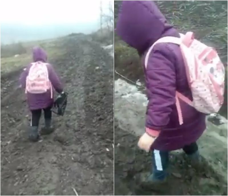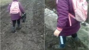 În imagini, o fetiță de clasa a-2-a se chinuie să parcurgă drumul spre școală și să nu rămână împotmolită în noroiul dens.