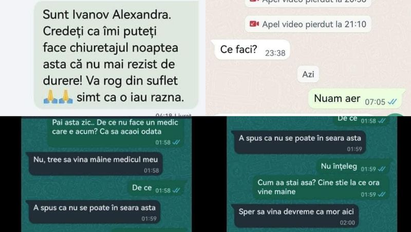 Din păcate, bebe e oprit din evoluție. Credeți că se poate face ceva să fiu chiuretată în seara asta? Că nu mai rezist de durere. Exact ca la naștere. Vă rog din suflet! (…) Sunt Ivanov Alexandra, credeți că-mi puteți face chiuretajul noaptea asta că nu mai pot de dureri. Vă rog suflet, simt că o iau razna”, sunt mesajele pe care tânăra le-a trimis, fără răspuns, medicului care îi supraveghea sarcina, dar și celui care era de gardă în noaptea cu pricina.