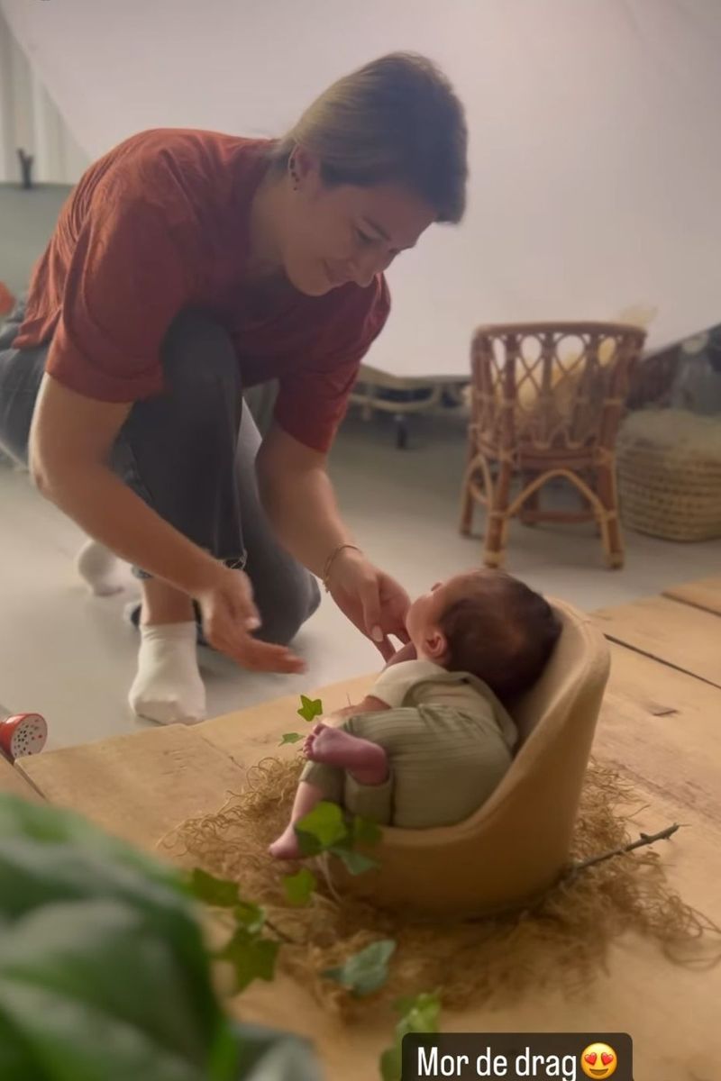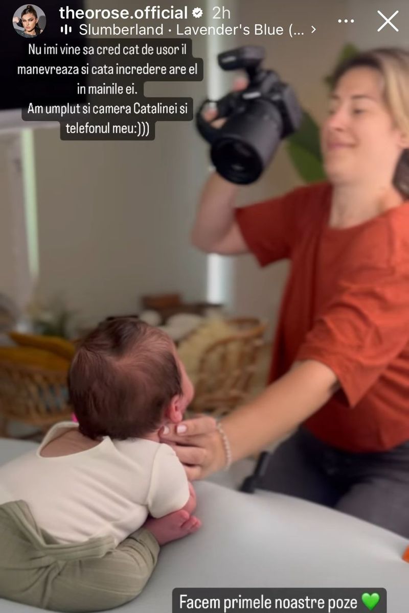 „Nu îmi vine să cred cât de ușor îl manevrează și câtă încredere are el în mâinile ei. Am umplut și camera Cătălinei și telefonul meu. Facem primele noastre poze. (…) Mor de drag.”, a scris Theo Rose, în dreptul imaginilor cu fiul ei, Sasha Ioan.