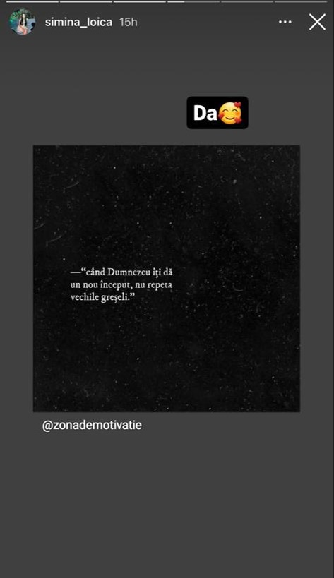 „Când Dumnezeu îți dă un nou început, nu repeta vechile greșeli. Da.”, a fost mesajul pe care Simina Loica l-a postat în mediul online.