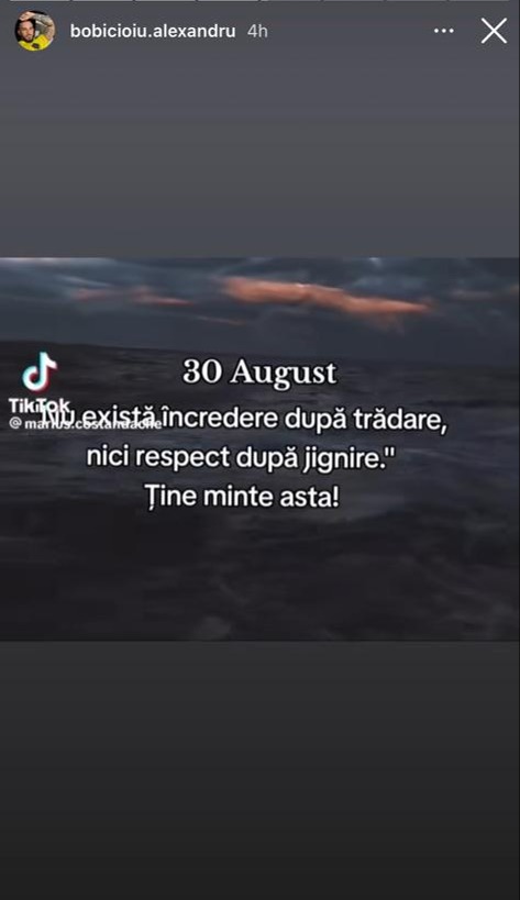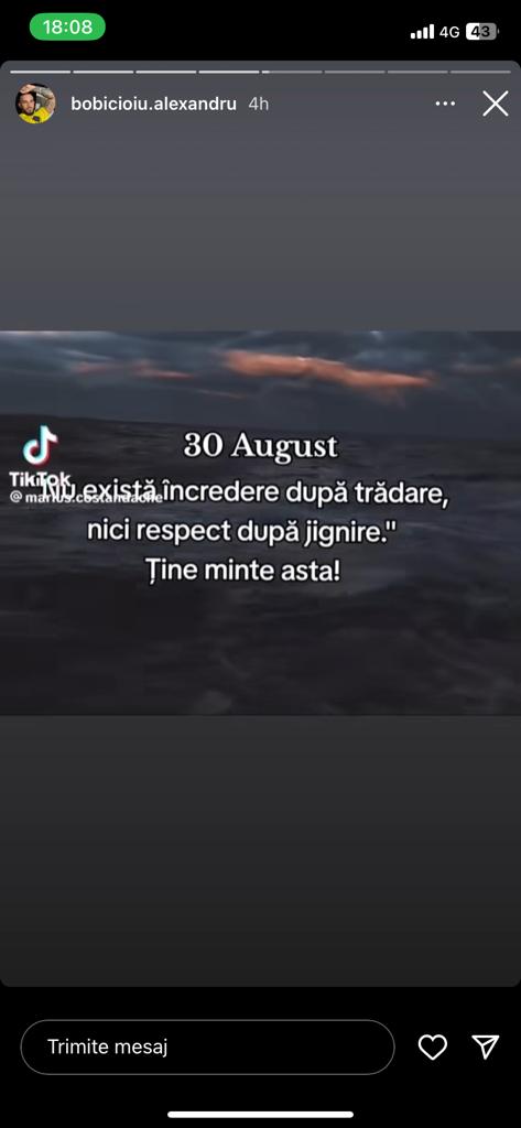 „Nu există încredere după trădare, nici respect după jignire. Ține minte asta!”, a fost unul dintre mesajele postate de Bobicioiu în mediul online.