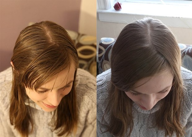 Foto stanga: Asa arata in primele 20 de zile fara sa se spele. Foto dreapta: asa arata dupa ce s-a spalat cu bicarbonat si otet de mereMargaret a respectat regula de a nu se spala pe cap timp de o luna, insa Katherine a continuat sa se spele cu bicarbonat de sodiu si sa foloseasca otet din cidru de mere pe post de balsam.