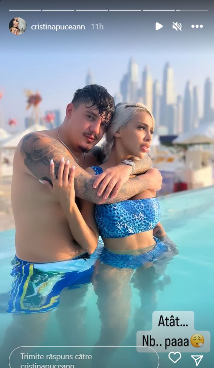 La scurt timp după acest moment, vedeta a distribuit la story la o imagine cu ea și manelistul, în timp ce stăteau îmbrățișați pe marginea luxoasei piscine de la hotel cu descrierea „Atât! Noapte bună, pa!”. Fanii au fost imediat convinși că Bogdan și Cristina sunt împreună, însă această fotografie nu este prima de acest gen, în trecut cei doi postând mai multe tik-tok-uri îmbrățișați.
