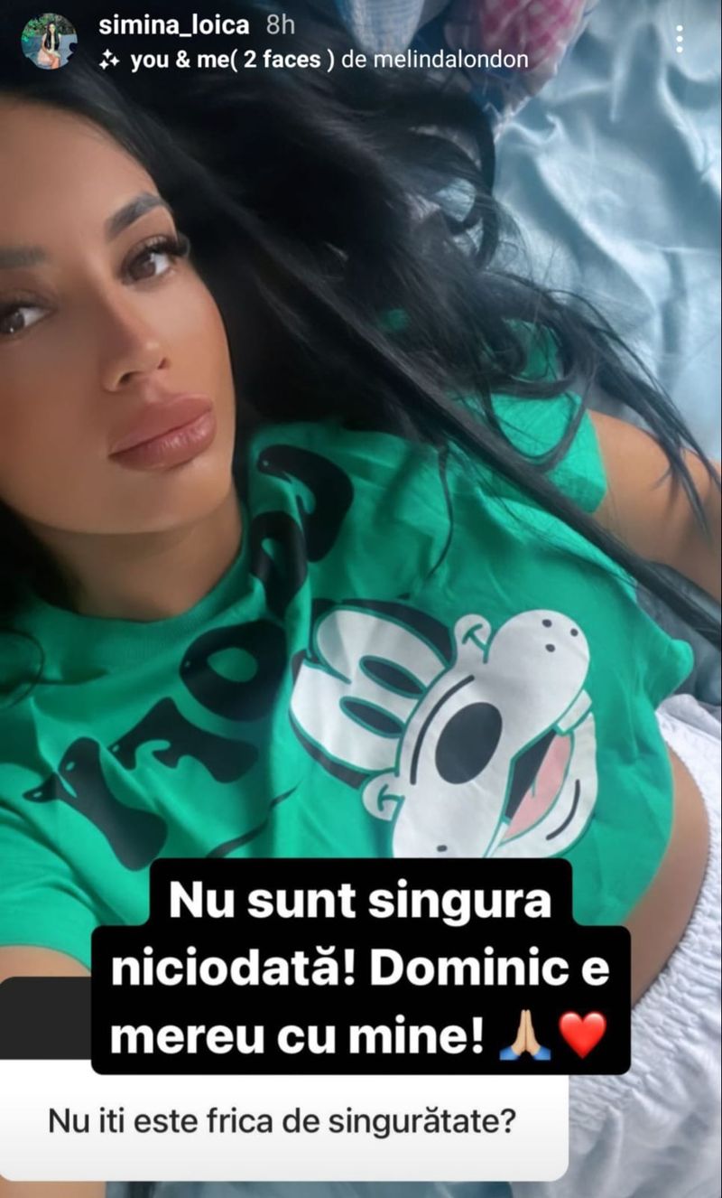 „Nu sunt singură niciodată! Îl am pe Dominic mereu cu mine!”, a răspuns Simina Loica.