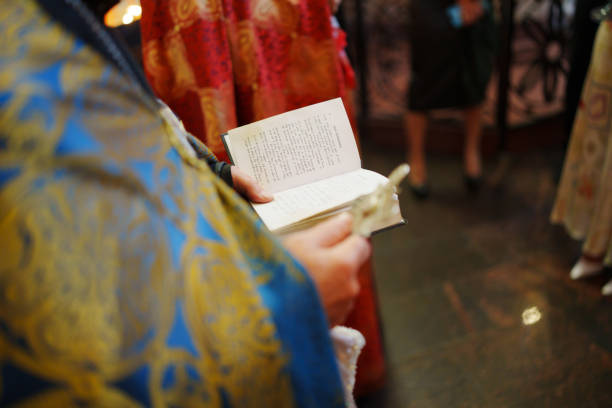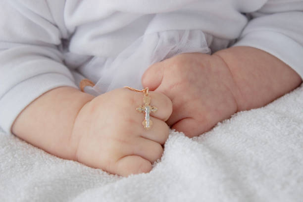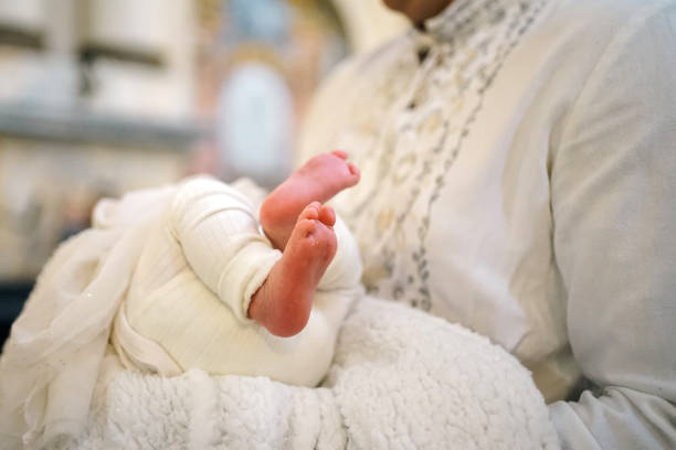 Un bebeluș, ținut în brațe în timpul slujbei de botez