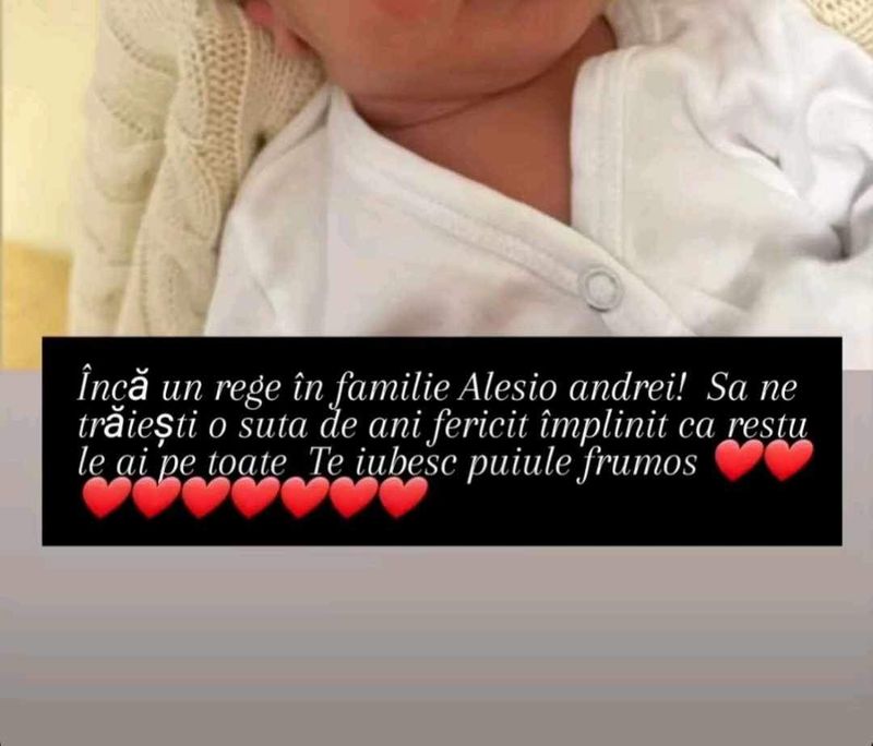 „Încă un rege în familie, Alesio Andrei! Să ne trăiești o sută de ani fericit, împlinit, că restul le ai pe toate. Te iubesc, puiule frumos!”, a scris Lambada, în dreptul unei imagini cu fiul ei, acolo unde a dezvăluit și numele pe care îl va purta cel de-al treilea copil al său.