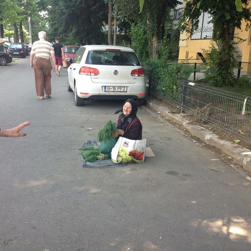 ”Vineri, 16.Iunie.2017! Această bătrânică imploră trecătorii, cu lacrimi în ochi, să cumpere mărar! Plângând spune că nu a vândut nimic de azi de dimineaţă…O găsiţi în zona Bucur Obor, la ieşirea din magazinul Obor, spre Doamna Ghica, lângă florărie! M-am oprit un minut lângă dansa, cu foarte mult nu am putut sa o ajut… Dar cu puţin de la mine, cu puţin de la voi, poate strânge de o gustare pe ziua de azi! Aceasta este bătrâneţea din zilele noastre! Păcat, păcat… Am plecat cu lacrimi in ochi, dar mulţumită sufleteşte că am putut să o strâng de mâna…