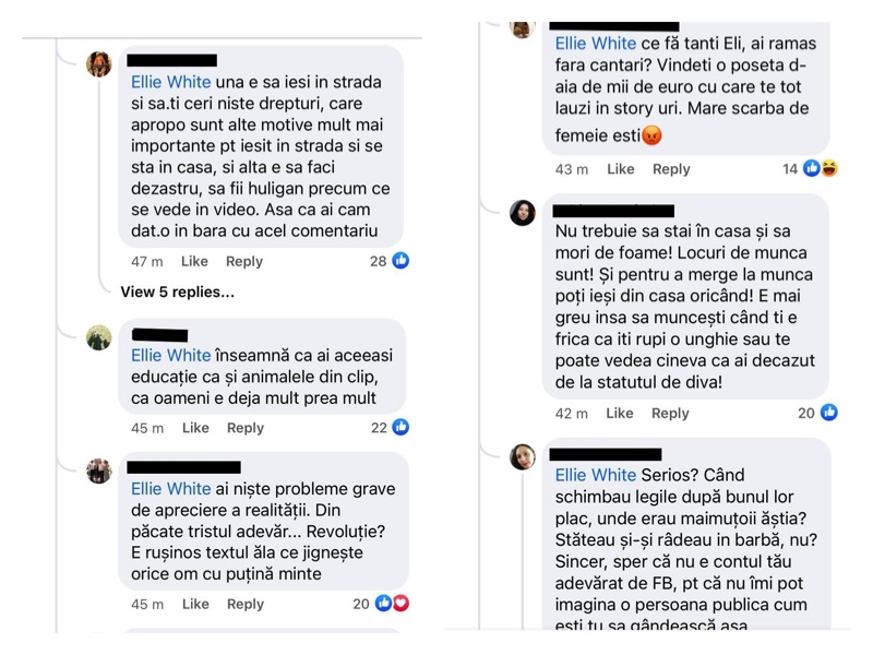 ” Din păcate, era de așteptat...țara întreagă musteste a revoluție...Măsurile luate de autorități nu prea ajută populația care NU are nicio vină pentru această criză sanitară, dar cumva toți se așteaptă ca oamenii să stea cuminti in casă și să moară de foame. Așa ceva nu se poate! Asta este o măsură normală, în concordanță cu ultimul an de bătaie de joc”, este mesajul postat de Ellie White, care a stârnit revolta internauților.