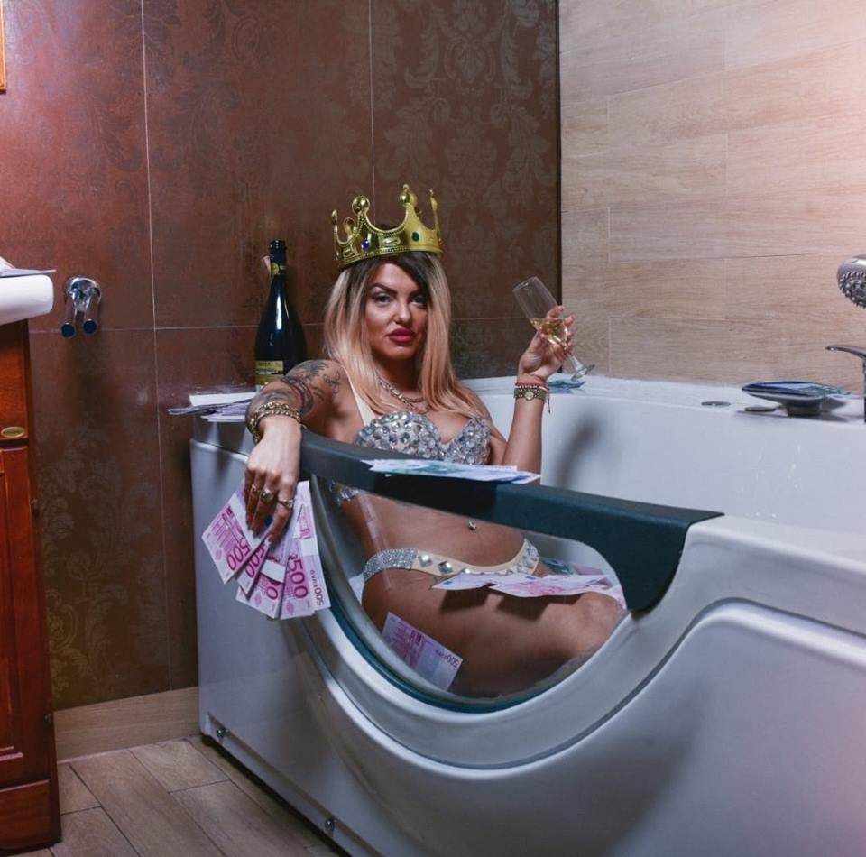 De curând, o dansatoare sexy de manele s-a pozat în cadă acoperită cu bancnote. Ea s-a pozat apoi pe un scăunel din sufragerie, covorul fiind acoperit de bancnote de 500 şi 100 de euro. „Îmi plac banii la nebunie!”, a postat dansatoarea.