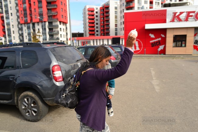 Imediat dupa, o alta femeie insotita de un grup de indivizi s-a indreptat spre ea sa ii ceara de mancare, iar speriata, aradeanca s-a urcat in masina si a demarat in forta.