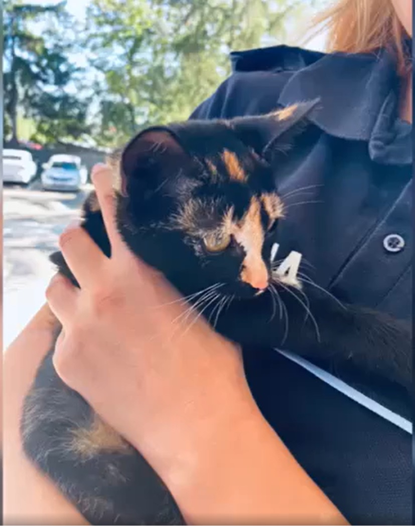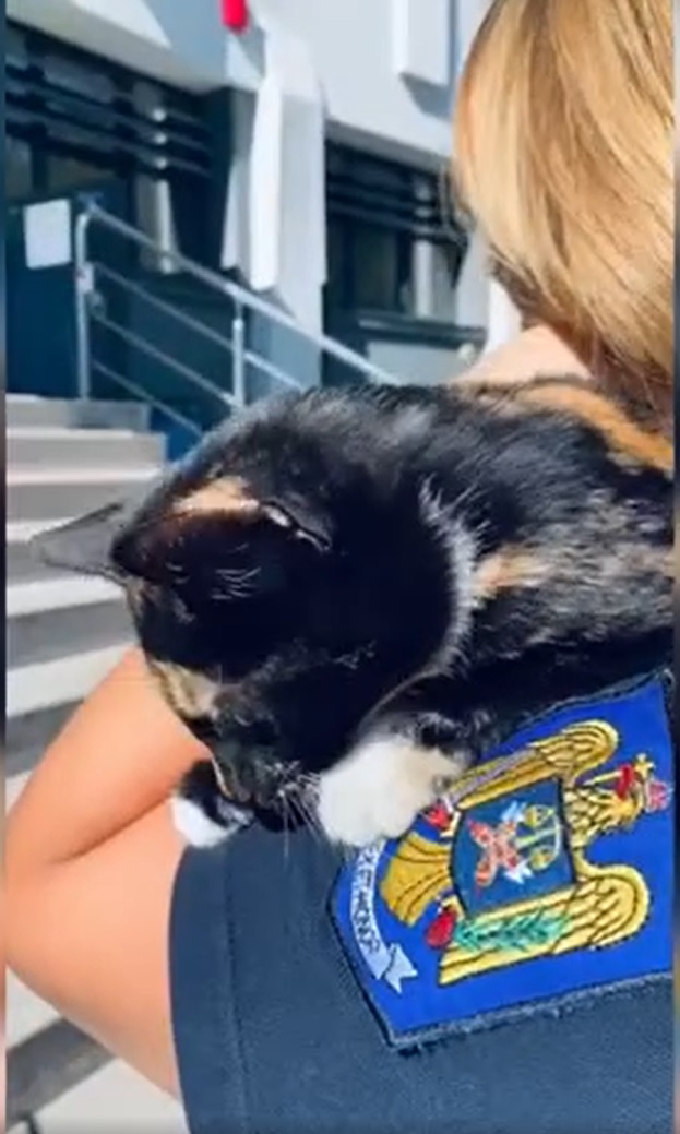 Polițiștii nu au putut rămâne indiferenți în fața pisicuței care rămăsese fără un cămin. Felina parcă le-a implorat ajutorul, motiv pentru care în scurt timp a fost adoptată de o agentă. Aceasta i-a trimis fiului său o fotografie cu pisicuța, iar în cele din urmă copilul a convins-o să o ia acasă.