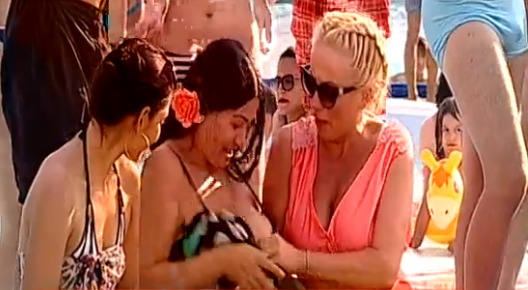 Femeia s-a speriat cand si-a dat seama ca a ramas asa in vazul tuturor si a tras rapid costumul de baie.