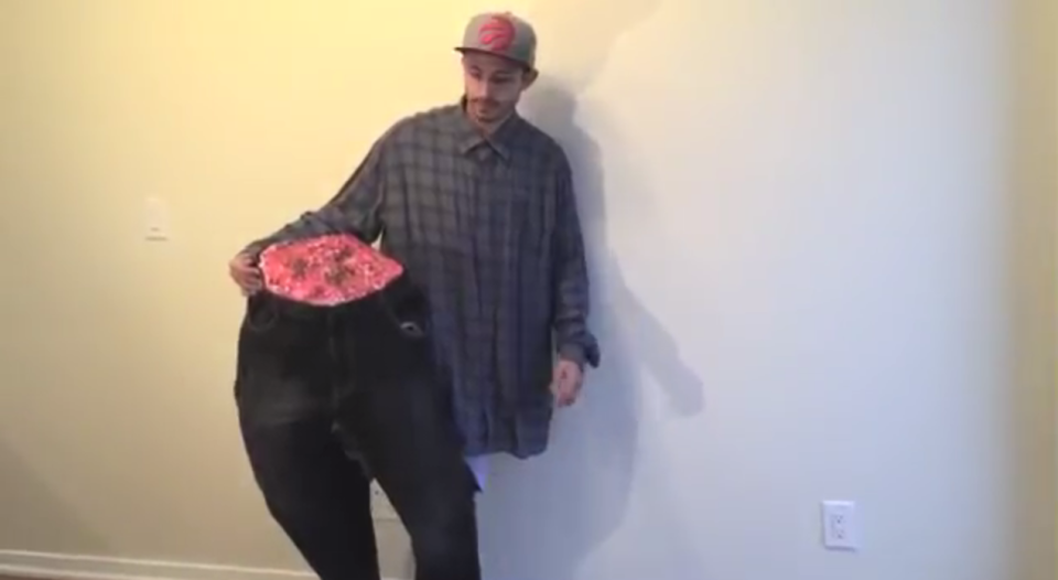 Un bărbat a explicat printr-un video pe internet cum oricine poate să îşi facă acasă acelaşi tip de costum. E nevoie doar de puţină îndemânare, o pereche de blugi mai mari cu talia înaltă şi un tricou de două ori mai lung decât cel pe care l-ai purta în mod obişnuit. Pantalonii trebuie tăiaţi în zona genunchilor în aşa fel încât să puteţi să întraţi în ei, iar restul trebuie umplut cu şerveţele de hârtie şi baloane umflate, pentru a părea că picioarele sunt în totalite în ei.