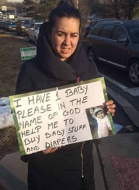 „Am un bebeluș. Vă rog, în numele lui Dumnezeu, ajutați-mă să cumpăr scutece și lucruri pentru copil”, scria cerșetoarea pe o pancartă, la marginea unui trotuar din New Jersey.