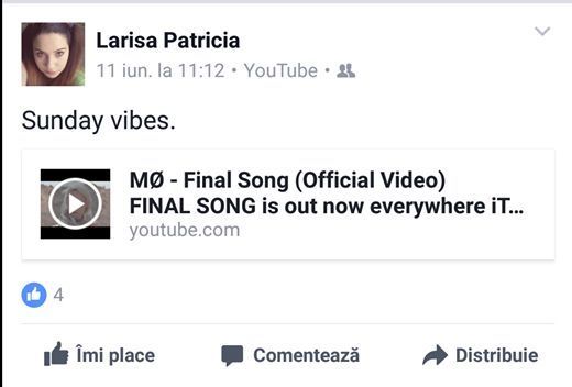 Larisa Patricia, fiica de politist, s-a spanzurat. Fata nu a lasat niciun bilet de adio, nu se stie ce a determinat-o sa faca acest gest extrem, insa in urma cu doua zile a postat pe Facebook o melodie cu un titlu care anunta ce are de gand sa faca: Final Song.
