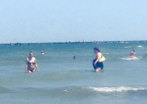 Femeia a fost fotografiata in Mamaia, intrand cu geanta pe umar in apa.