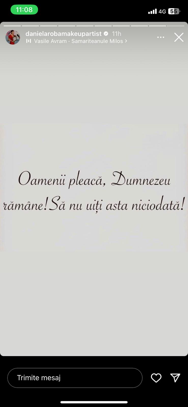 „Oamenii te vor părăsi în momentele de suferință, dar Dumnezeu nu te va părăsi niciodată.”, „Oamenii pleacă, Dumnezeu rămâne! Să nu uiți asta niciodată!”, au fost mesaje pe care Dana Roba le-a postat în mediul online recent.