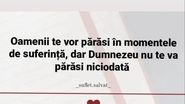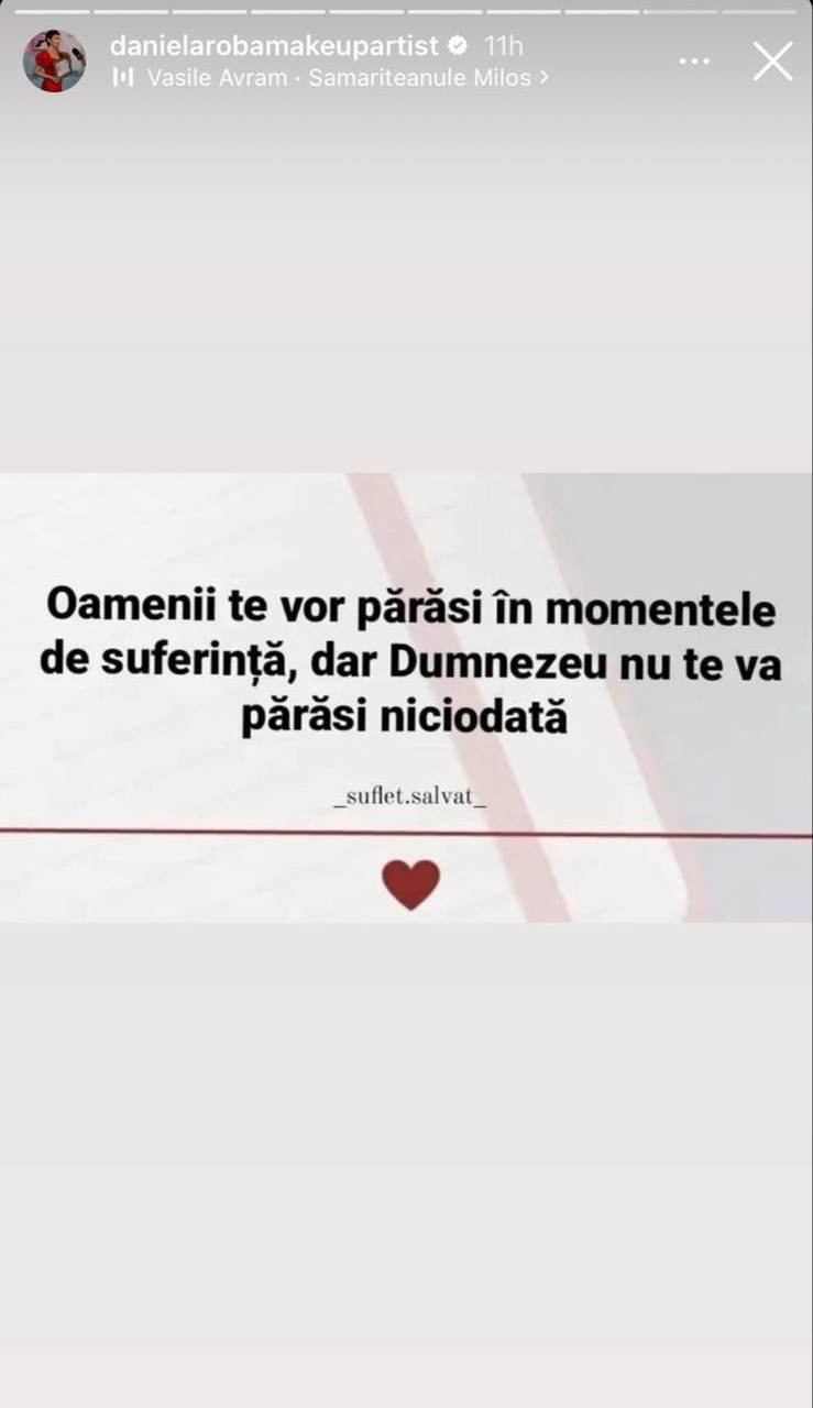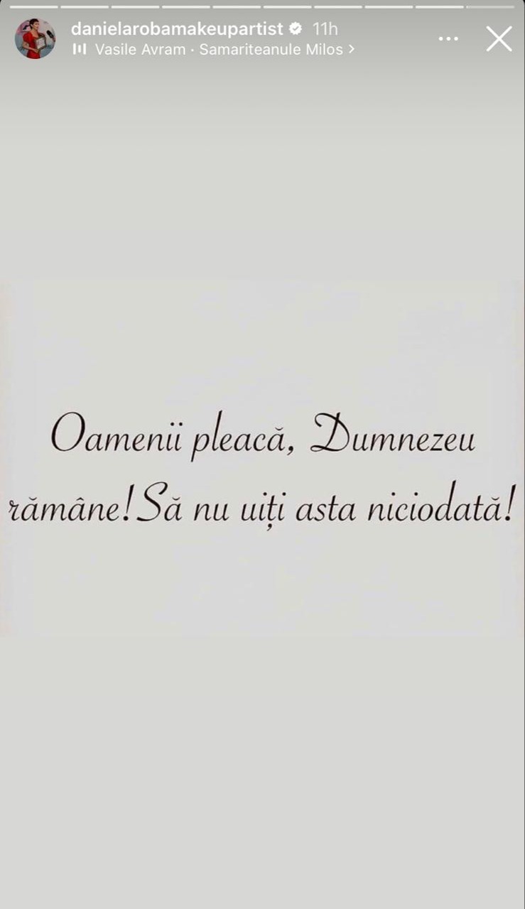 Acum, Dana Roba a dat de înțeles din nou că ar avea parte de dezamăgiri în plan personal, după ce ar fi fost părăsită de unele persoane în momentele grele.„Oamenii te vor părăsi în momentele de suferință, dar Dumnezeu nu te va părăsi niciodată.”, „Oamenii pleacă, Dumnezeu rămâne! Să nu uiți asta niciodată!”, au fost mesaje pe care Dana Roba le-a postat în mediul online recent.