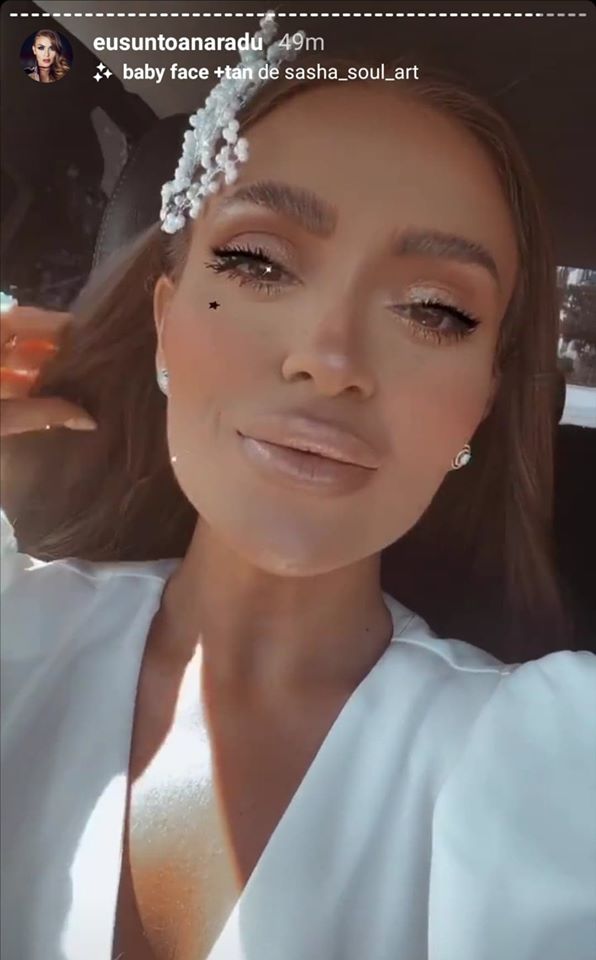 Artista le-a arătat deja fanilor săi de pe Instagram rochia superbă pe care o poartă în cea mai importantă zi din viața ei. Machiată și coafată, îmbrăcată într-o rochie albă și cu un decolteu adânc, Oana Radu s-a filmat și a postat mai multe videoclipuri la secțiunea de story de pe Instagram.