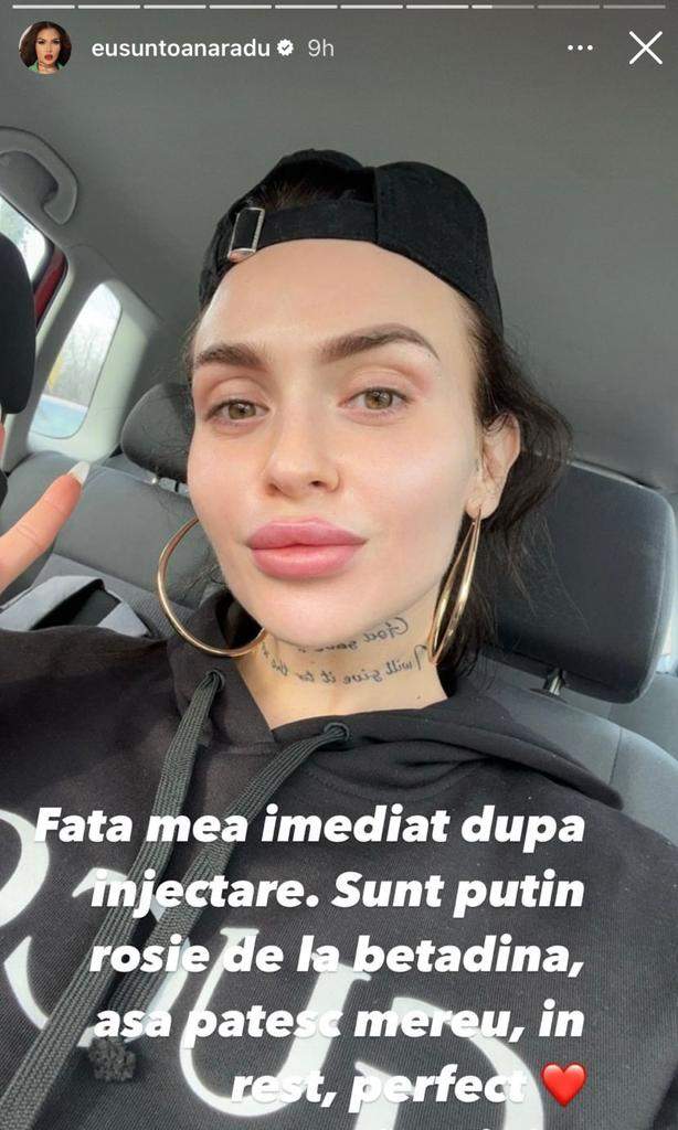 ”Fața mea imediat după injectare. Sunt puțin roșie de la betadină, așa pățesc mereu, în rest, perfect”, a transmis Oana Radu pe pagina sa de Instagram, la secțiunea Stories.
