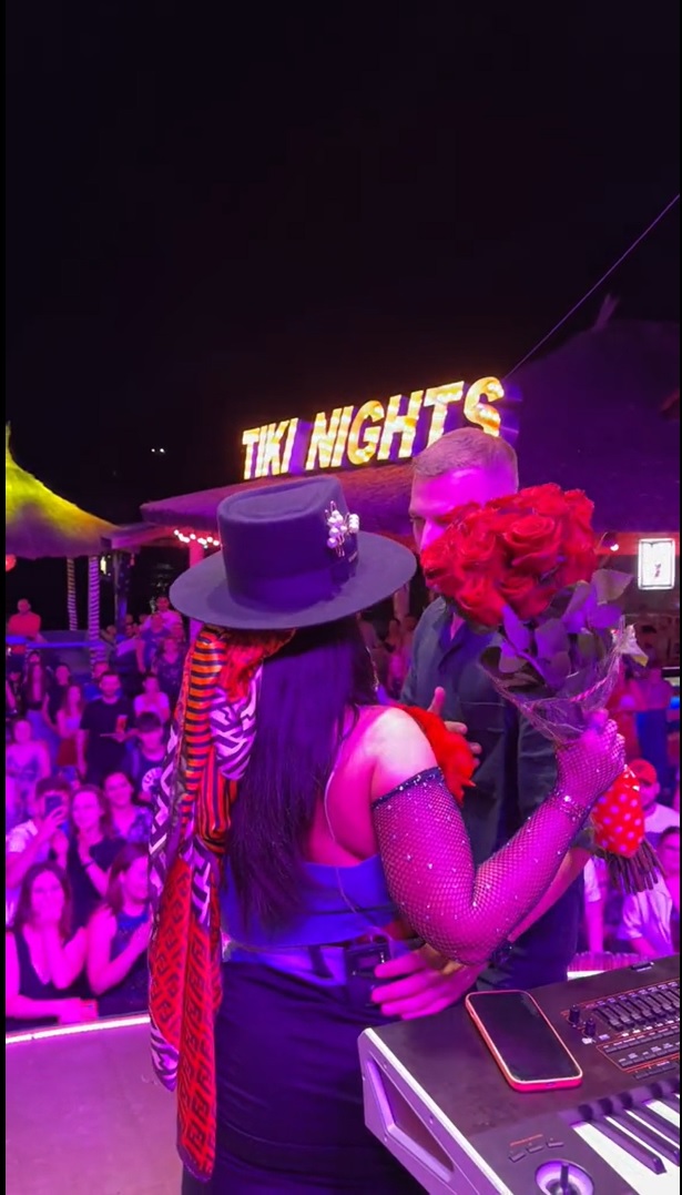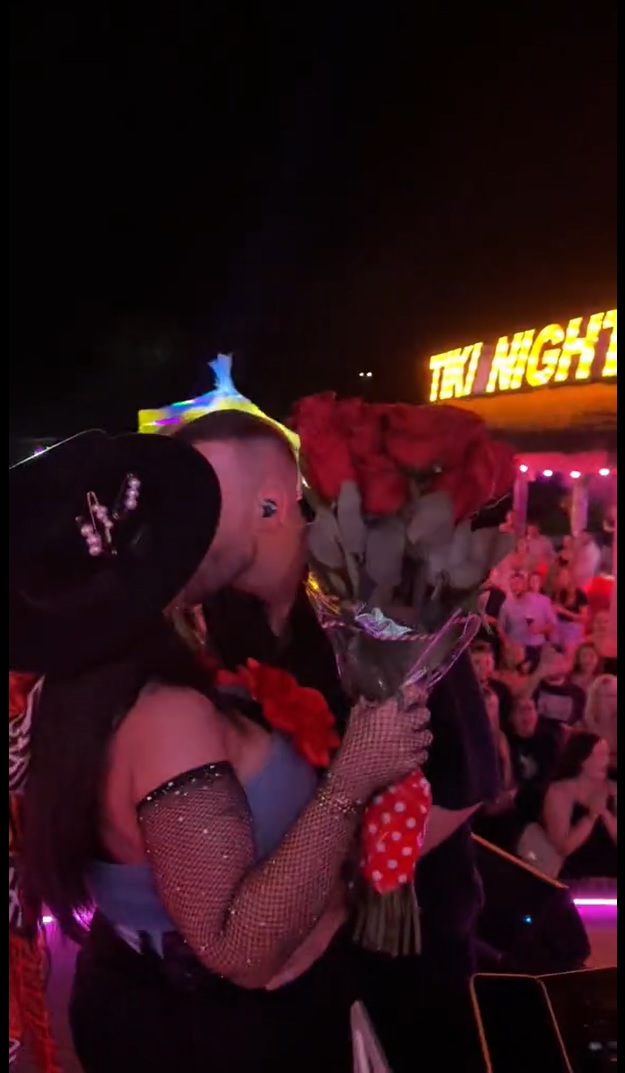 „Și eu sunt foarte îndrăgostită de tine. Și dacă suntem îndrăgostiți unul de celălalt ce putem să facem? Să ne pupăm!”, a mărturisit Oana Radu pe scenă, înainte să se sărute cu bărbatul misterios.