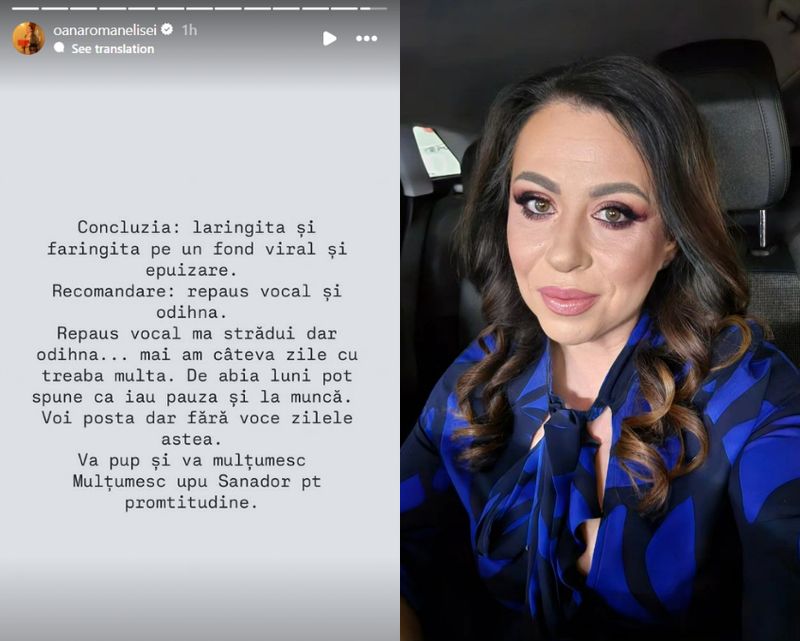 Se pare că vedeta are nevoie de repaus vocal și multă odihnă.„Concluzia: laringita și faringita pe un fond viral și epuizare. Recomandare: repaus vocal și odihnă. Repaus vocal mă strădui, dar odihnă... Mai am câteva zile cu treabă multă. De abia luni pot spune că iau pauză și la muncă. Voi posta, dar fără voce zilele astea. Vă pup și vă mulțumesc”, a mai declarat Oana Roman despree starea ei de sănătate.