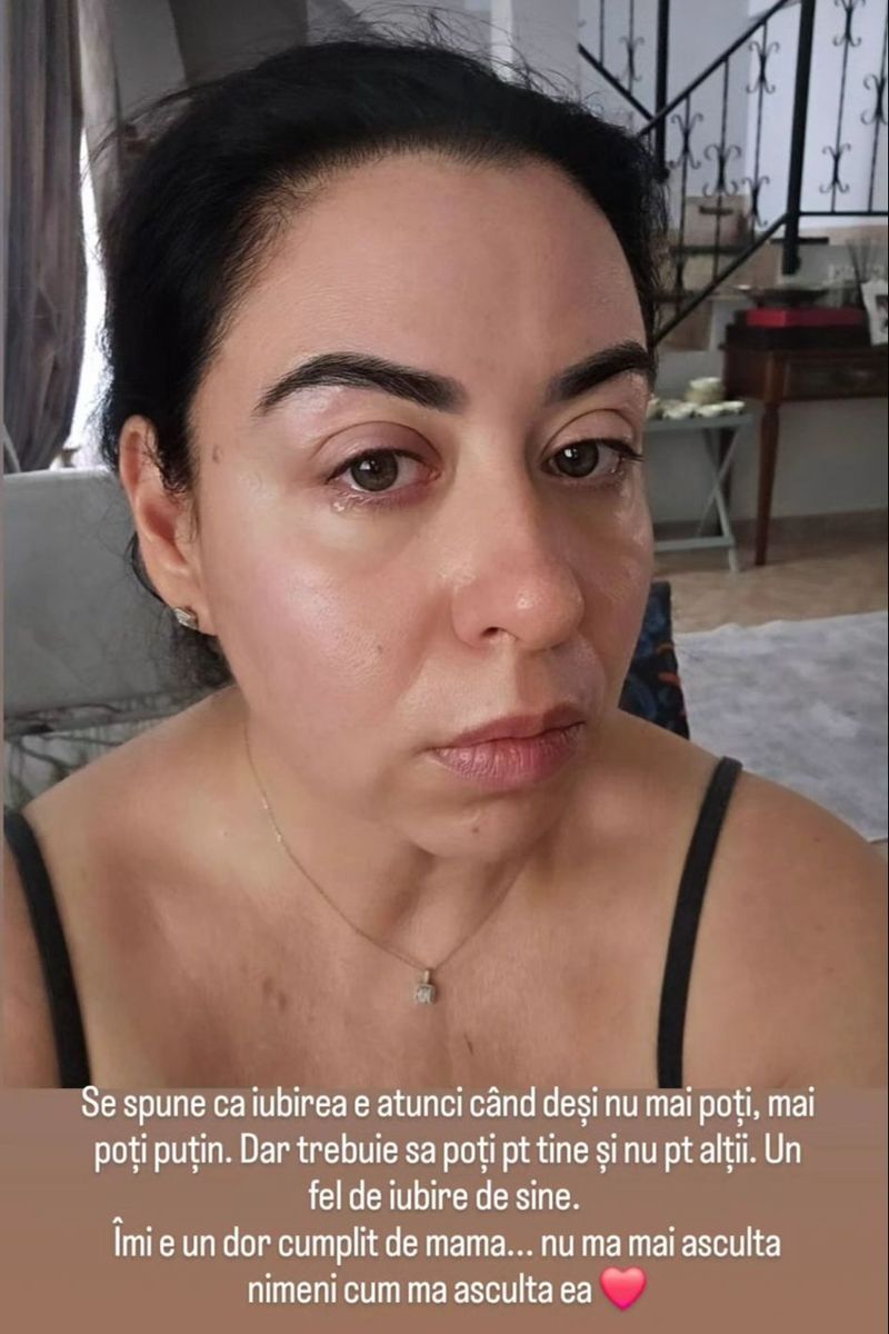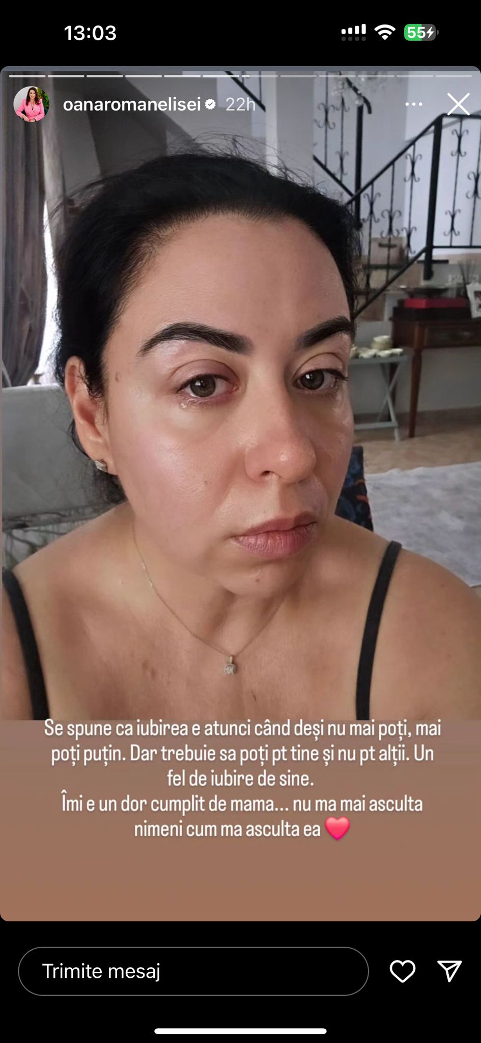 „Se spune că iubirea e atunci când deși nu mai poți, mai poți puțin. Dar trebuie să poți pentru tine și nu pentru alții. Un fel de iubire de sine. Îmi e un dor cumplit de mama… nu mă mai ascultă nimeni cum mă asculta ea”, este mesajul transmis de Oana Roman, în dreptul unei imagini unde apare cu lacrimi în ochi.