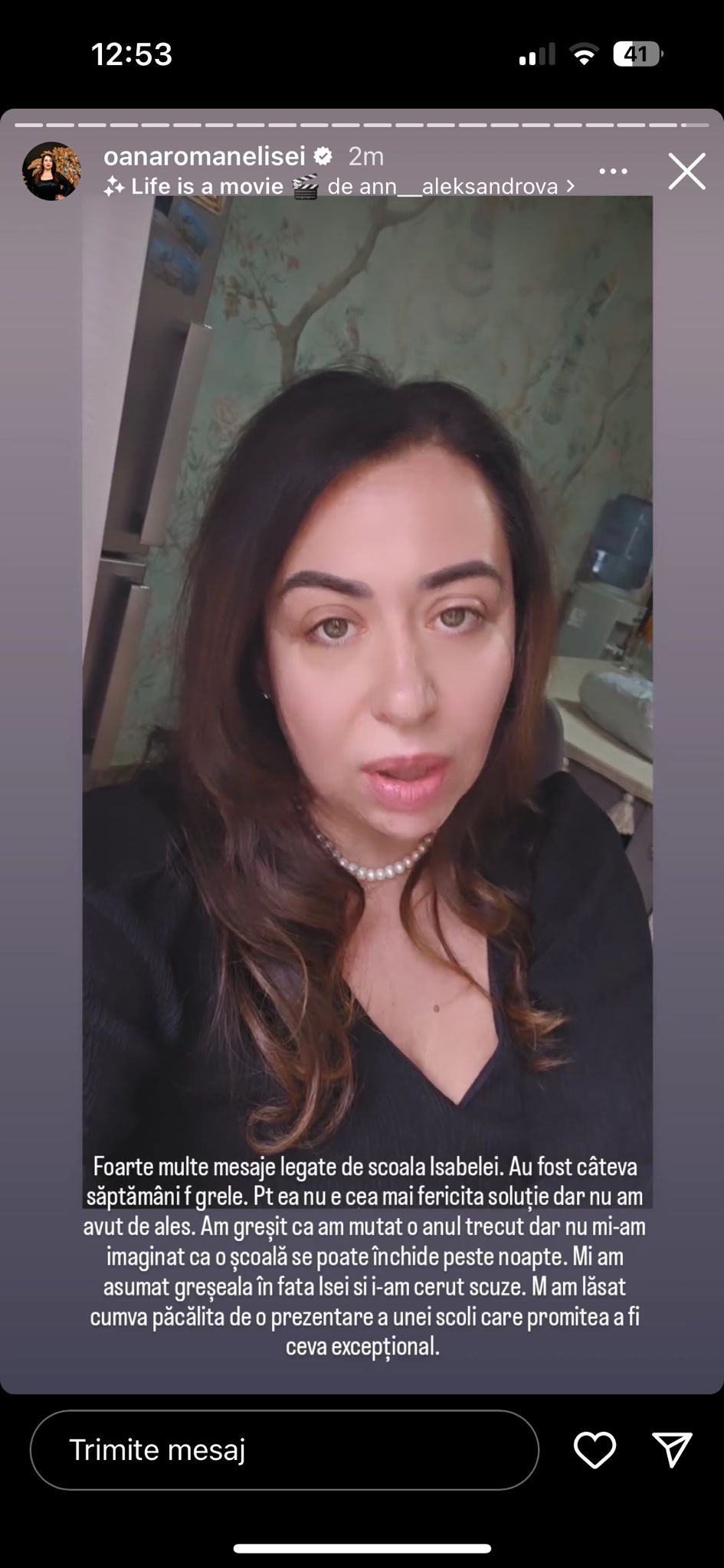 „Foarte multe mesaje legate de școala lsabelei. Au fost câteva săptămâni foarte grele. Pentru ea nu e cea mai fericită soluție dar nu am avut de ales. Am greșit că am mutat-o anul trecut dar nu mi-am imaginat că o școală se poate închide peste noapte. Mi-am asumat greșeala în fata lsei și i-am cerut scuze. M-am lăsat cumva păcălită de o prezentare a unei școli care promitea a fi ceva excepțional.”, a dezvăluit Oana Roman pe Instagram.