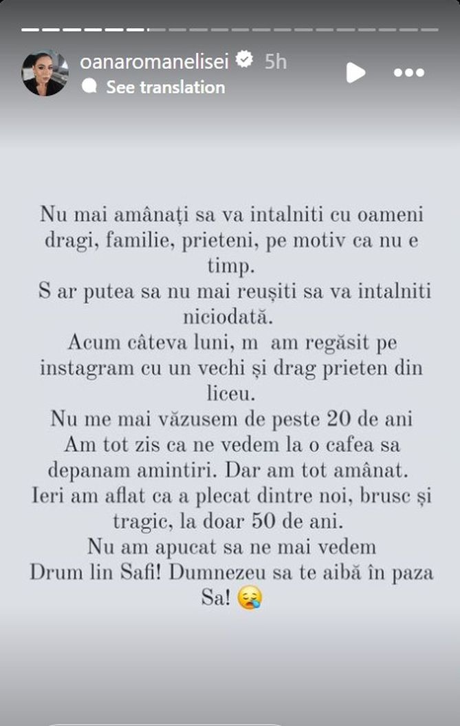 „Nu mai amânați să vă întâlniți cu oameni dragi, familie, prieteni, pe motiv că nu e timp. S-ar putea să nu mai reușiți să vă întâlniți niciodată. Acum câteva luni, m-am regăsit pe Instagram cu un vechi și drag prieten din liceu. Nu ne mai văzusem de peste 20 de ani. Am tot zis că ne vedem la o cafea să depănăm amintiri, dar am tot amânat. Ieri am aflat că a plecat dintre noi, brusc și tragic, la doar 50 de ani. Nu am apucat să ne mai vedem. Drum lin Safi! Dumnezeu să te aibă în paza Sa!”, a scris Oana Roman, pe Instagram.