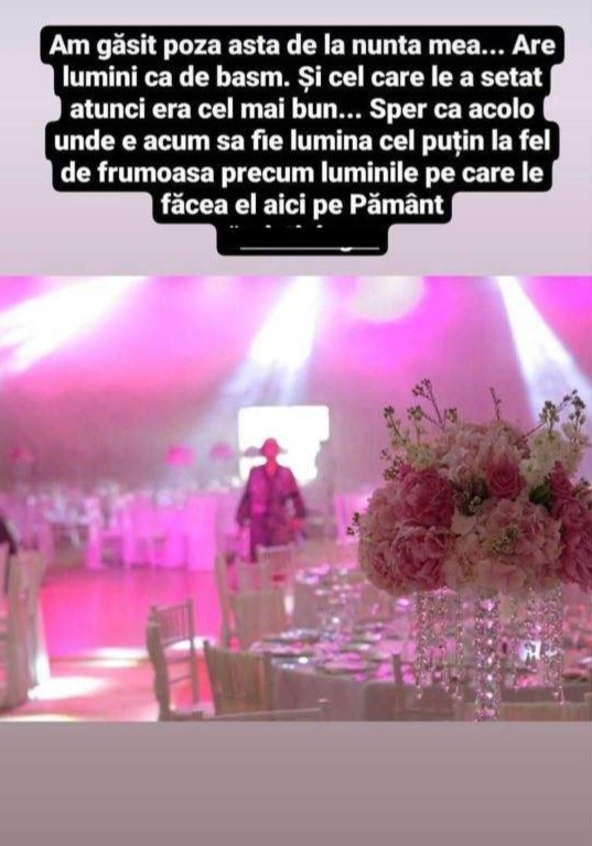 Vedeta a început să se uite la poze din trecut și a dat pentru o fotografie care i-a trezit multe amintiri. Este vorba despe o fotografie de la nunta ei. La grandiosul eveniment, Oana Roman s-a asigurat că nui lipsește nimic, de la flori, la fotografii, la o locație de vis. De asemenea, pentr ca totul să fie perfect, ea a angajat pe cineva specializat pentru a se ocupa de lumini. Se pare că angajatul respectiv s-a stins din viață, iar ea nu s-a putut abține să nu scrie câteva rânduri despre cât de încântată a fost de serviciile sale și că regretă enorm că a plecat dintre noi.