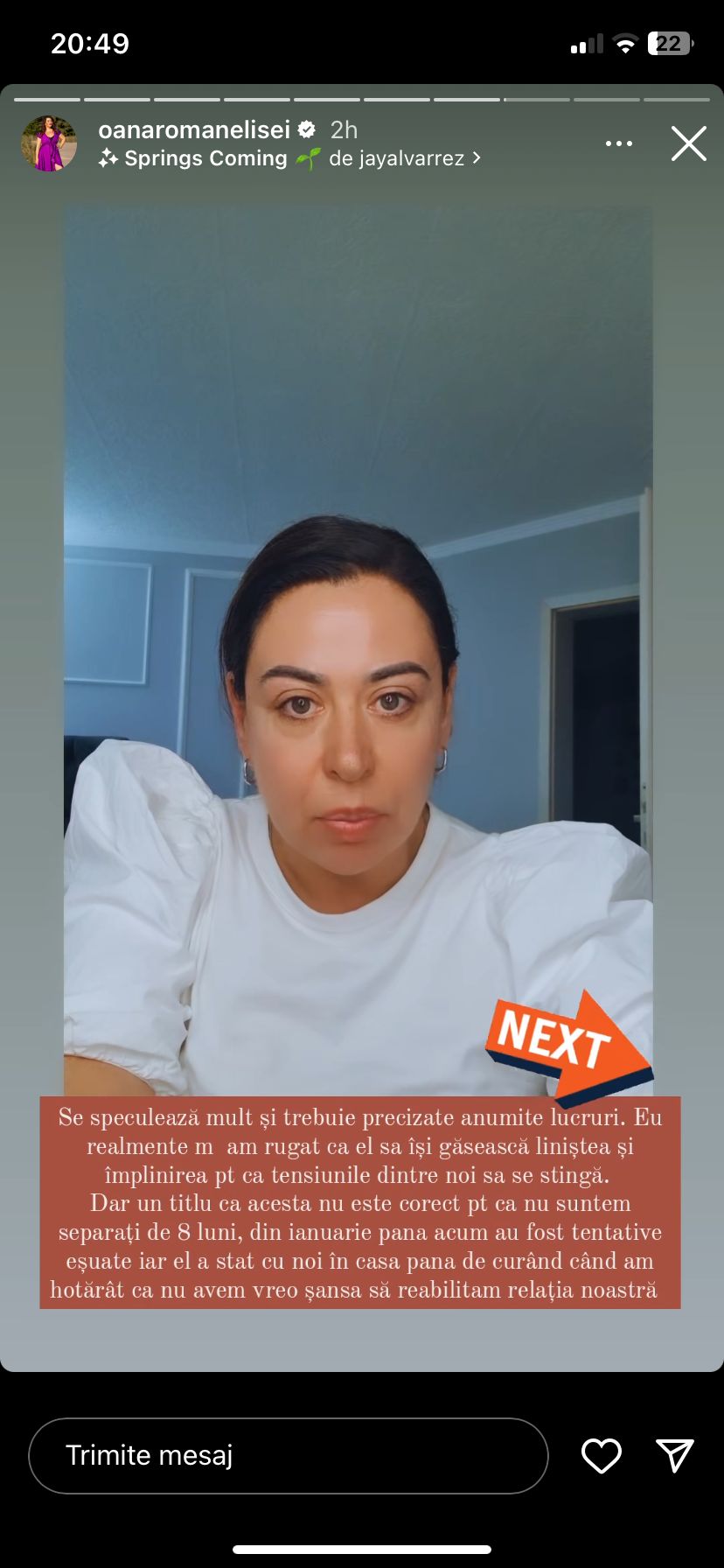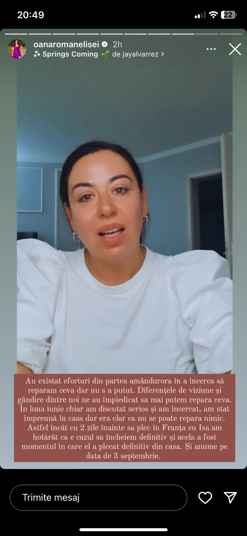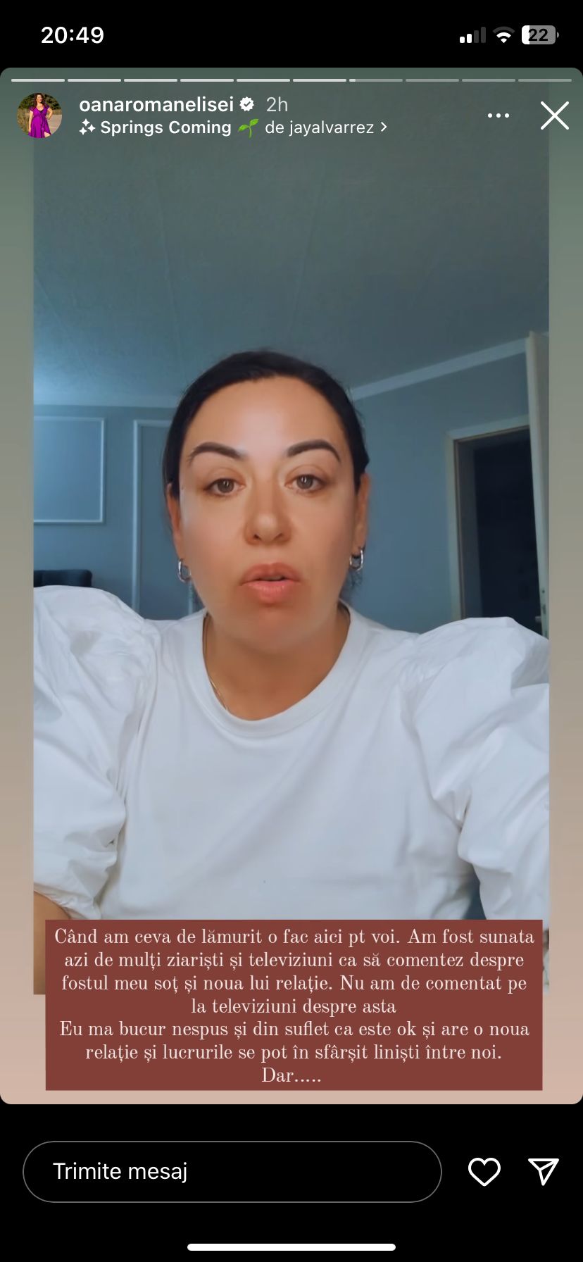 „Eu mă bucur foarte mult, sincer și din suflet, că el este în regulă, că are o nouă relație și că lucrurile, în sfârșit, se pot liniști între noi. Dar, evident că presa speculează foarte mult și el a dat o declarație în care a spus că nu mai vrea să audă despre mine, nu mai vrea să vorbească despre mine, că are o nouă relație și este foarte fericit, lucru care pe mine mă bucură, pentru eu pentru asta m-am rugat, ca el să își găsească o nouă relație ca să ne putem liniști (…)”, a declarat Oana Roman, pe Instagram.